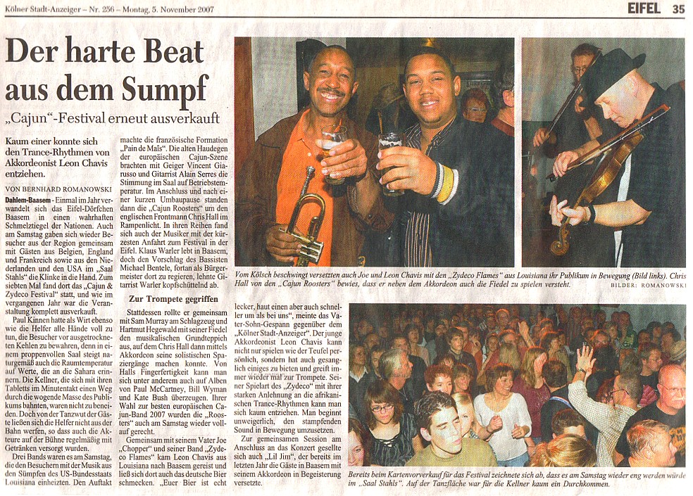 Gemeinsam mit seinem Vater Joe „Chopper“ und seiner Band „Zydeco Flames“ kam Leon Chavis aus Louisiana nach Baasem gereist und ließ sich dort auch das deutsche Bier schmecken. „Euer Bier ist echt lecker, haut einen aber auch schneller um als bei uns“, meinte das Vater-Sohn-Gespann gegenüber dem „Kölner Stadt-Anzeiger“. Der junge Akkordeonist Leon Chavis kann nicht nur spielen wie der Teufel persönlich, sondern hat auch gesanglich einiges zu bieten und greift immer wieder mal zur Trompete. Seiner Spielart des „Zydeco“ mit ihrer starken Anlehnung an die afrikanischen Trance-Rhythmen kann man sich kaum entziehen. Man beginnt unweigerlich, den stampfenden Sound in Bewegung umzusetzen.