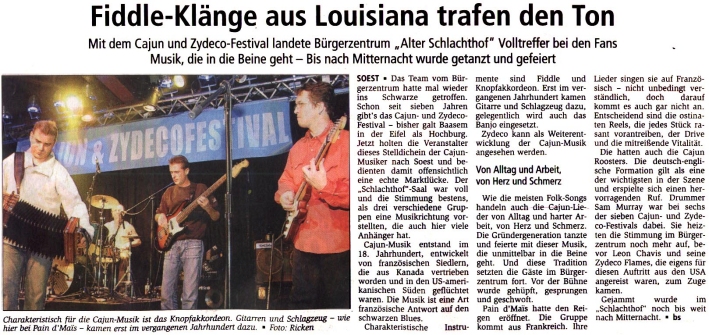 Stattdessen rollte er gemeinsam mit Sam Murray am Schlagzeug und Hartmut Hegewald mit seiner Fiedel den musikalischen Grundteppich aus, auf dem Chris Hall dann mittels Akkordeon seine solistischen Spaziergänge machen konnte. Von Halls Fingerfertigkeit kann man sich unter anderem auch auf Alben von Paul McCartney, Bill Wyman und Kate Bush überzeugen. Ihrer Wahl zur besten europäischen Cajun-Band 2007 wurden die „Roosters“ auch am Samstag wieder vollauf gerecht.