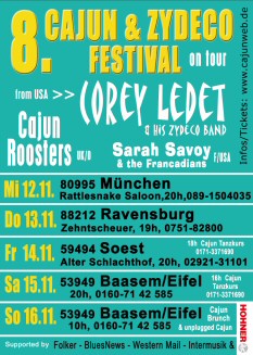 Sarah Savoy eröffnete wieder mit ‚Hey Baby', einem flotten Cajunrocker den Abend. Das Publikum ging schnell mit, die Tanzfläche füllte sich und Sarah durfte erst nach einer Zugabe von der Bühne. Ein rascher Umbau brachte die Cajun Roosters auf die Bühne. Mit ‚Danse de Limonade', einem Klassiker von Austin Pitre eröffnen sie ihren Set. Und auch hier wird zu Jean Lafitte, Double Shot und ‚Keep your hands off of it' kräftig abgetanzt. Da der Abend pünktlich zu Ende gehen musste (ein genervter Nachbar ruft sonst eine Minute später an und beschwert sich), geht der Cajun Roosters Set nach 12 Songs sehr schnell zu Ende. Eine kurze Zugabe, schneller Umbau und schon stehen Corey und seine Band auf der Bohne. Besonders die im zweiten Teil auf dem Hohner Tastenakkordeon gespielten Songs begeistern nicht nur den aus dem nahen Trossingen angereisten Productmanager der Firma Hohner, Horst Fausel, sondern das gesamte Publikum. In vorderster Reihe tanzt auch Michael Borrasch, der das Festival auf nach Ravensburg eingeladen hat. Corey Ledets mitreißender Set verwandelt die Zehntscheuer in einen Tanzschuppen in Louisiana. Das Publikum tanzt in den Gängen und würde gerne lange feiern. Aber der Nachbar ! Doch die Musiker haben eine Idee. Nachdem die PA stummgeschaltet ist, packen alle ihre Instrumente und spielen sehr zur Freude des Publikums noch ein paar Nummern unplugged. Da kann man James B. Adams am Accordion im Duett mit Corey Ledet erleben und triple fiddles mit Chris Hall, Hartmut Hegewald und Vincent Blin. So bleibt der Abend weiter unterhaltsam und der Nachbar ist auch nicht genervt.