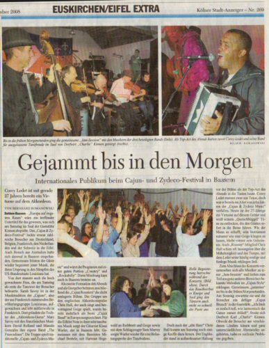 Gestern Morgen klang das Festival mit einem zünftigen Cajun-Brunch aus. Wieder einmal war der kleine Eifelort Baasem der Abschluss einer erfolgreichen Tournee durch Deutschland, angefangen in München über Ravensburg bis nach Soest. Denn auch hierzulande findet diese eigenwillige Musik immer mehr begeisterte Anhänger.