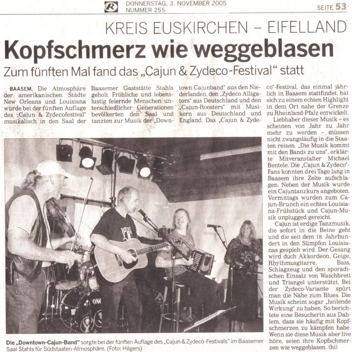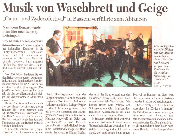 Als nächste nahmen die „Cajun Roosters“ die Instrumente in die Hand. Hervorgegangen aus den „Cajun Pioneers“, kam es nach dem tragischen Tod ihres Gründers und Akkordeonspielers, Luitger Fräger, zu der Umbenennung dieser Gruppe, die auch weiterhin den „cajun-typischen“ Weg beibehalten wollte. Hartmut Hegewald an Geige und „Scrubboard“ - auf Deutsch: „Waschbrett“ - und Michael Bentele als Bassist und Manager der Band sowie der Gitarrist Klaus Warler, der auch der Hauptorganisator des Baasemer Festivals ist, fanden bald schon kongeniale Verstärkung: Die beiden Briten Sam Murray am Schlagzeug und Chris Hall am diatonischen Akkordeon bilden eine ideale Neubesetzung der Band.