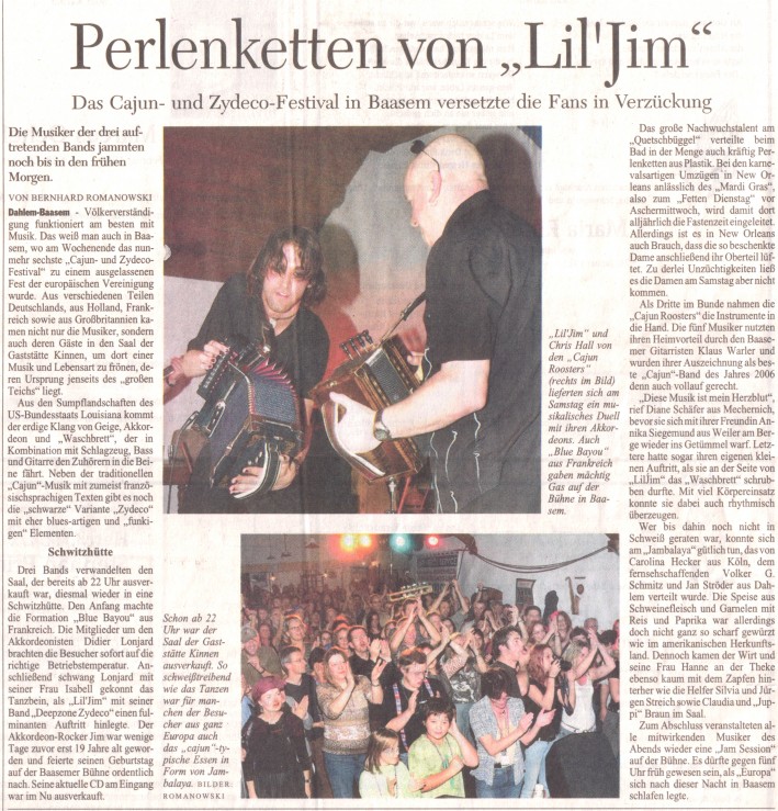 Dahlem-Baasem - Völkerverständigung funktioniert am besten mit Musik. Das weiß man auch in Baasem, wo am Wochenende das nunmehr sechste „Cajun- und Zydeco-Festival“ zu einem ausgelassenen Fest der europäischen Vereinigung wurde. Aus verschiedenen Teilen Deutschlands, aus Holland, Frankreich sowie aus Großbritannien kamen nicht nur die Musiker, sondern auch deren Gäste in den Saal der Gaststätte Kinnen, um dort einer Musik und Lebensart zu frönen, deren Ursprung jenseits des „großen Teichs“ liegt. Aus den Sumpflandschaften des US-Bundesstaats Louisiana kommt der erdige Klang von Geige, Akkordeon und „Waschbrett“, der in Kombination mit Schlagzeug, Bass und Gitarre den Zuhörern in die Beine fährt. Neben der traditionellen „Cajun“-Musik mit zumeist französischsprachigen Texten gibt es noch die „schwarze“ Variante „Zydeco“ mit eher blues-artigen und „funkigen“ Elementen. Drei Bands verwandelten den Saal, der bereits ab 22 Uhr ausverkauft war, diesmal wieder in eine Schwitzhütte. Den Anfang machte die Formation „Blue Bayou“ aus Frankreich. Die Mitglieder um den Akkordeonisten Didier Lonjard brachten die Besucher sofort auf die richtige Betriebstemperatur. Anschließend schwang Lonjard mit seiner Frau Isabell gekonnt das Tanzbein, als „Lil'Jim“ mit seiner Band „Deepzone Zydeco“ einen fulminanten Auftritt hinlegte. Der Akkordeon-Rocker Jim war wenige Tage zuvor erst 19 Jahre alt geworden und feierte seinen Geburtstag auf der Baasemer Bühne ordentlich nach. Seine aktuelle CD am Eingang war im Nu ausverkauft.