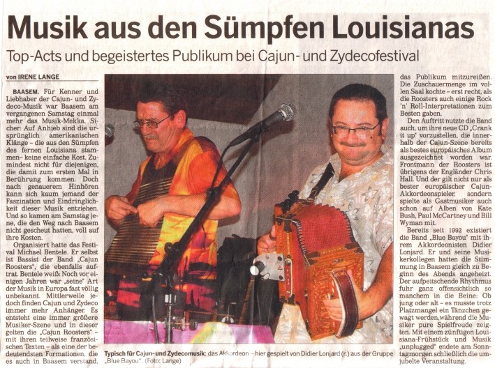 Als Dritte im Bunde nahmen die „Cajun Roosters“ die Instrumente in die Hand. Die fünf Musiker nutzten ihren Heimvorteil durch den Baasemer Gitarristen Klaus Warler und wurden ihrer Auszeichnung als beste „Cajun“-Band des Jahres 2006 denn auch vollauf gerecht.