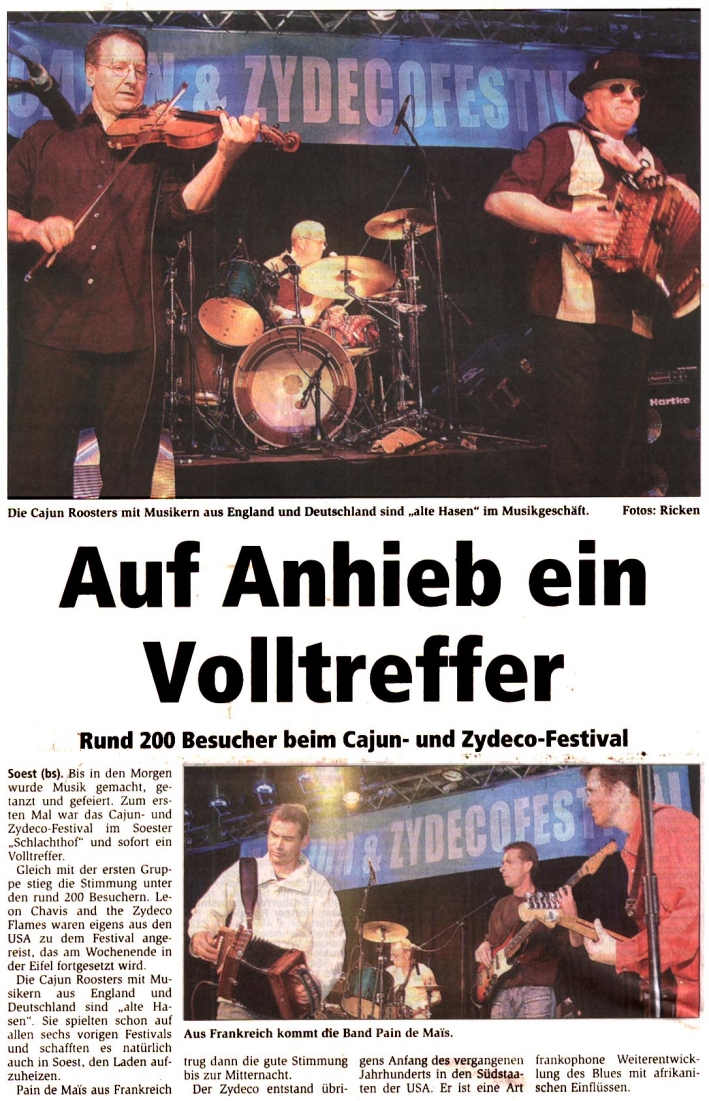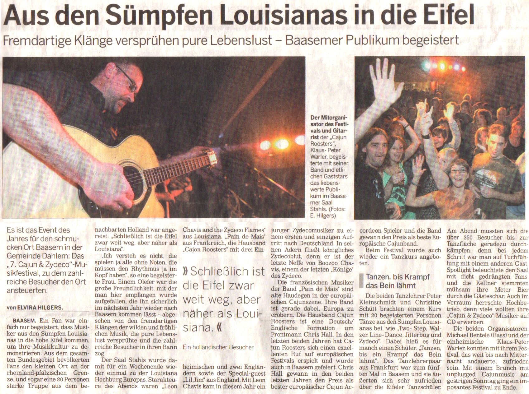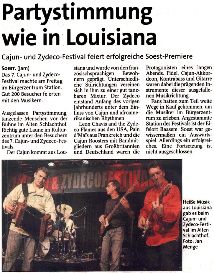 Gemeinsam mit seinem Vater Joe „Chopper“ und seiner Band „Zydeco Flames“ kam Leon Chavis aus Louisiana nach Baasem gereist und ließ sich dort auch das deutsche Bier schmecken. „Euer Bier ist echt lecker, haut einen aber auch schneller um als bei uns“, meinte das Vater-Sohn-Gespann gegenüber dem „Kölner Stadt-Anzeiger“. Der junge Akkordeonist Leon Chavis kann nicht nur spielen wie der Teufel persönlich, sondern hat auch gesanglich einiges zu bieten und greift immer wieder mal zur Trompete. Seiner Spielart des „Zydeco“ mit ihrer starken Anlehnung an die afrikanischen Trance-Rhythmen kann man sich kaum entziehen. Man beginnt unweigerlich, den stampfenden Sound in Bewegung umzusetzen.