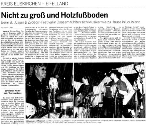 Gestern Morgen klang das Festival mit einem zünftigen Cajun-Brunch aus. Wieder einmal war der kleine Eifelort Baasem der Abschluss einer erfolgreichen Tournee durch Deutschland, angefangen in München über Ravensburg bis nach Soest. Denn auch hierzulande findet diese eigenwillige Musik immer mehr begeisterte Anhänger.