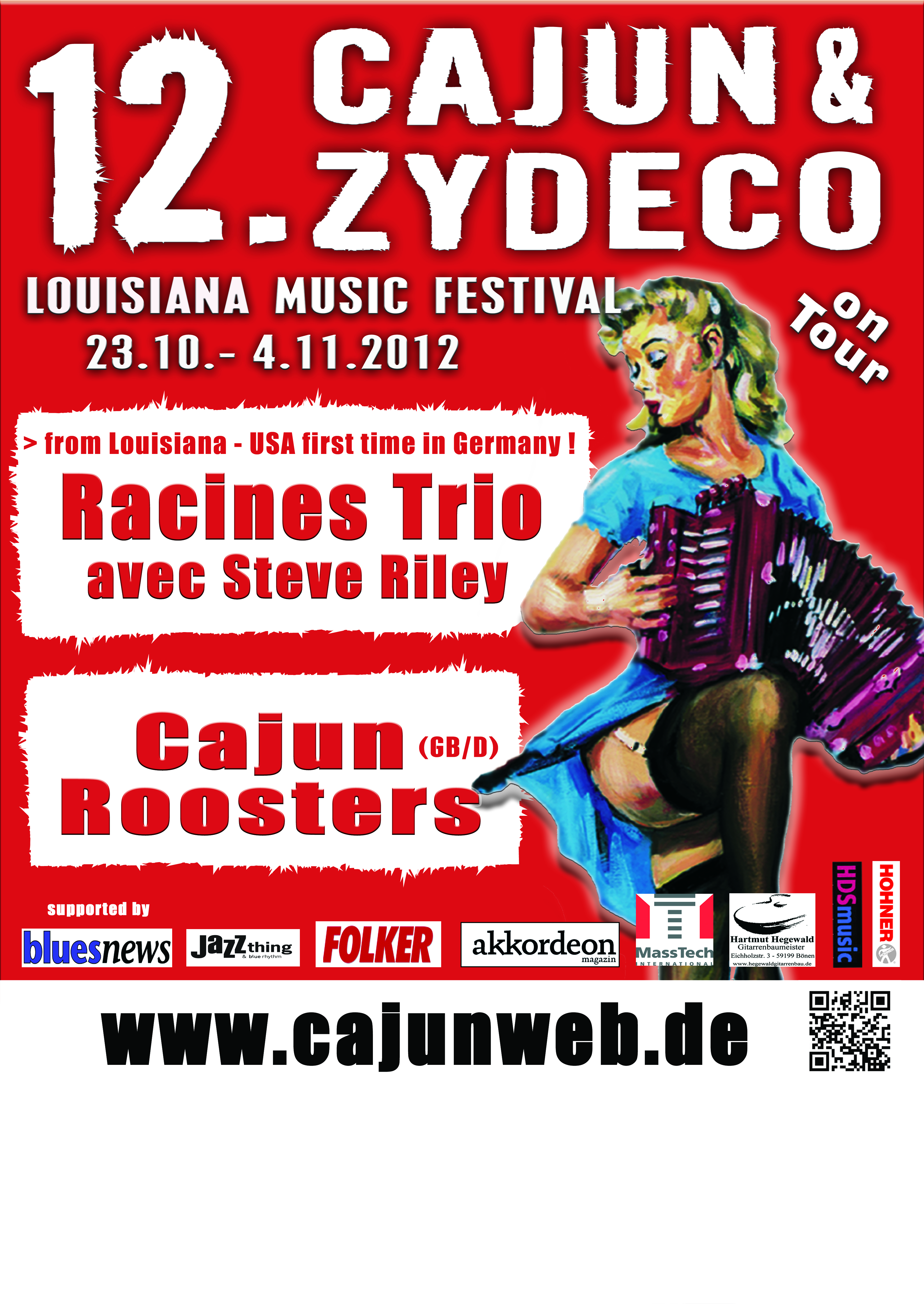 - Die in USA und Europa preisgekrönten Cajun Roosters (UK/D) als gastgebende Band. Seit 2010 jetzt mit Sängerin und Gitarristin Hazel Scott aus Schottland. In ganz Europa unterwegs, 4 CDs, Awards in Europa und Louisiana. Am Accordion Chris Hall, der als Gastmusiker mit Paul McCartney, Bill Wyman und mit Seth Lakeman im Studio und auf Tour war. Die aktuelle CD: 'okra and a pepper' wurde beim CFMA 'prix dehors de nous' in Louisiana 2012 wie schon die Vorgänger CDs der Band ausgezeichnet.